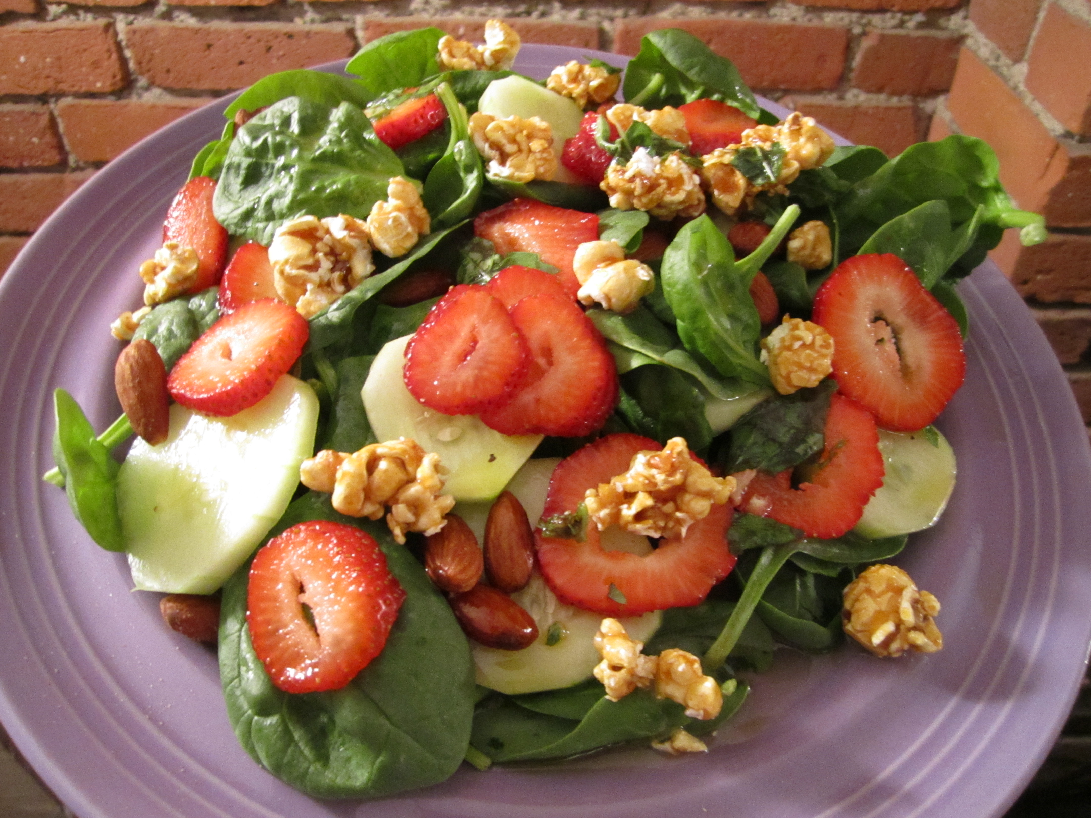 1. In a large mixing bowl, combine strawberries, spinach leaves, cucumber, caramel corn and almonds.