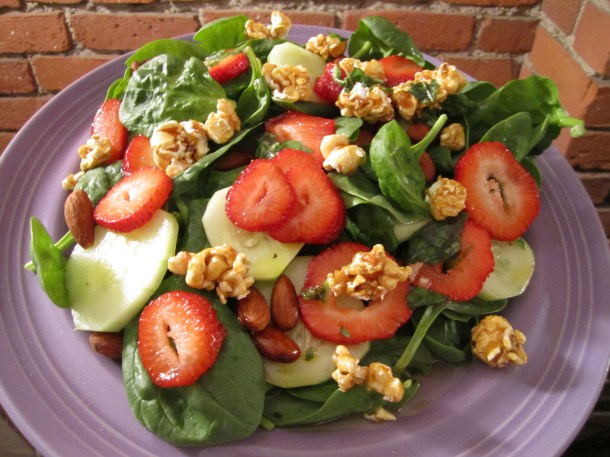 Using Divvies, the same brand of caramel corn Chef TJ used, this is my attempt to capture that deliciousness. Juicy sweet strawberries, hearty spinach leaves, salty almonds, light cucumbers and a warm sweet confection…each balanced bite will delight your taste buds. The vinaigrette complements the salad’s ingredients, fusing peppery licorice of the basil, tart lemon juice, earthy olive oil and slightly sweet rice vinegar. Indulge your sweet tooth and get your veggies with this balanced summer salad.