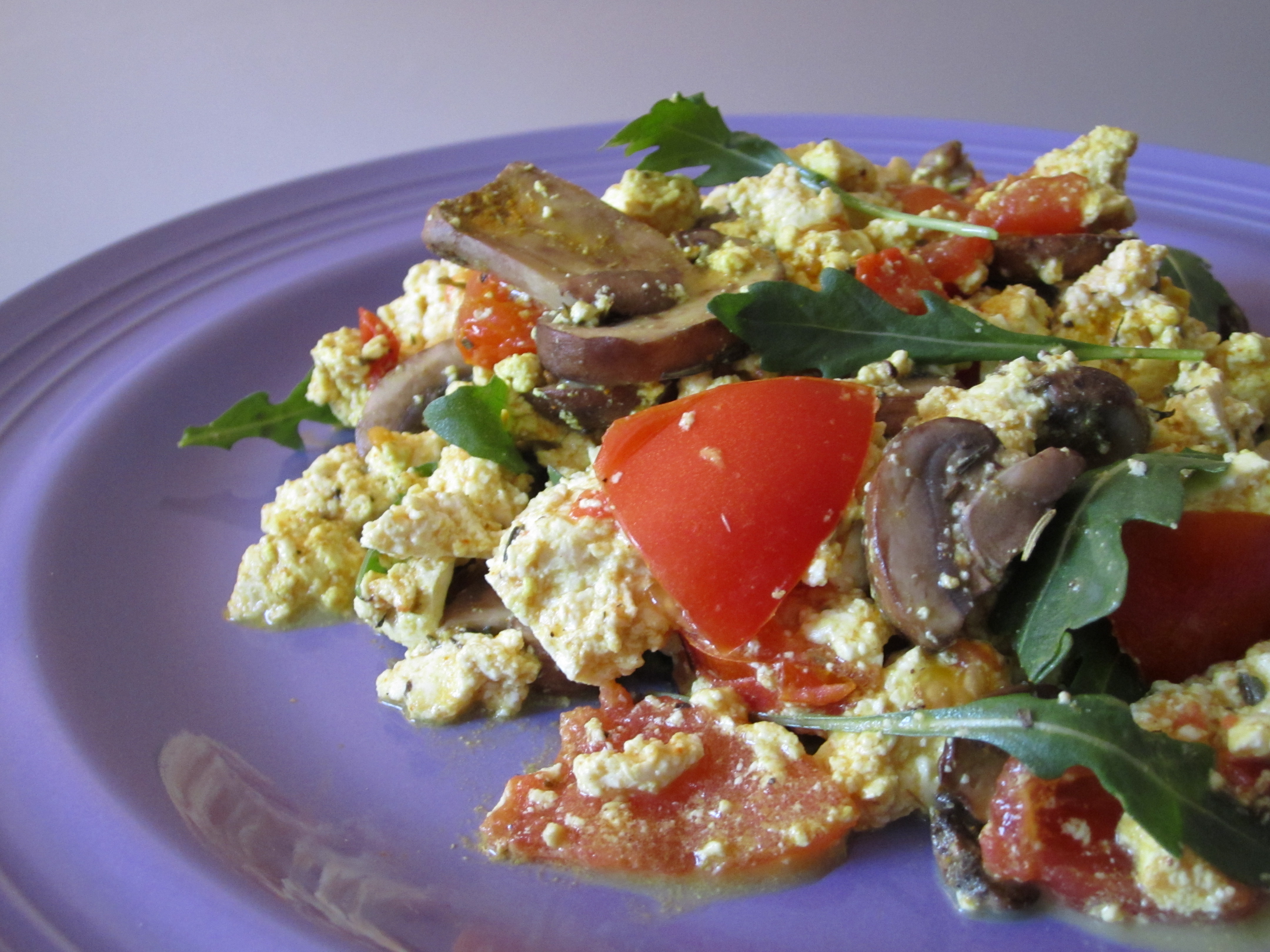 I love a tofu scramble. They’re so unassuming. You might think, what’s so special about a tofu scramble? But if it’s made well…ahhh. Hearty and heavenly. I’ve cooked tofu scramble before. But after eating the Arugula, Mushroom and Tomato Tofu Scramble from my fave vegan brunch hotspot True Bistro (seriously amazing brunch including THE best vegan Bloody Marys ever), I knew I had to replicate it at home.